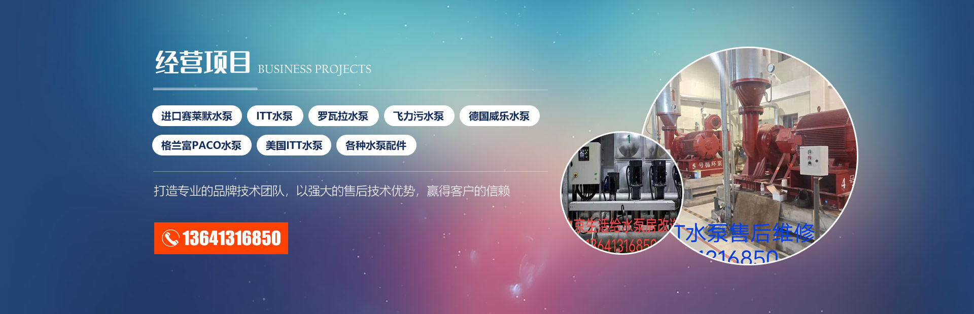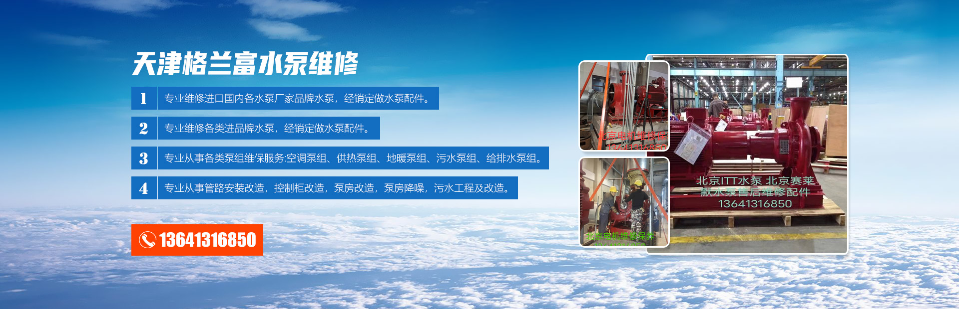 维修项目:专业维修进口国内各水泵厂家品牌水泵,经销定做水泵配件。专业维修各类进口品牌水泵,经销定做水泵配件。专业从事各类泵组维保服务:空调泵组、供热泵组、地暖泵组、污水泵组、给排水泵组。专业从事管路安装改造,控制柜改造,泵房改造,泵房降噪,污水工程及改造。